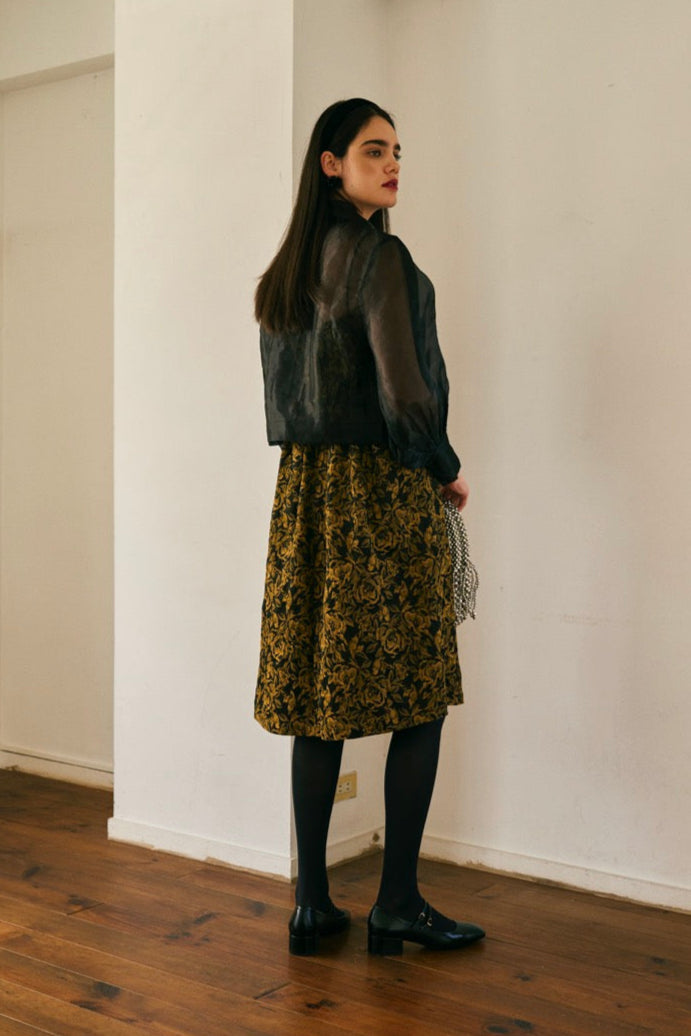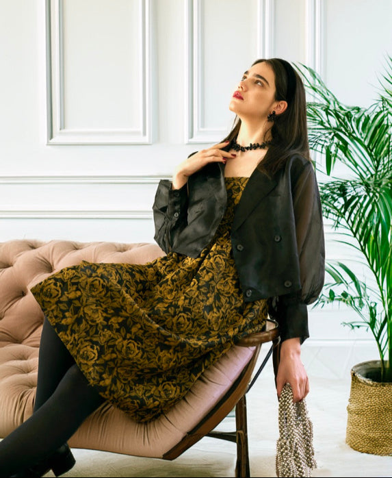 フランス製の贅沢なシワ加工ジャカード生地を使用した、フローラルジャカードストラップドレスです。ストラップ長さ調整可能、背中のヨークにはエレガントな伸縮性のあるゴムのスモッキングが施され、幅広いサイズまで着心地を実現。サイズ36~38に対応しています(下記の寸法をご覧ください)。洗練されたシーンにぴったりのこのドレスは、フランスの職人技と時代を超えた洗練さが融合しています。パーティーに最適で、シルクオーガンジージャケットと合わせると洗練された魅力が増します。