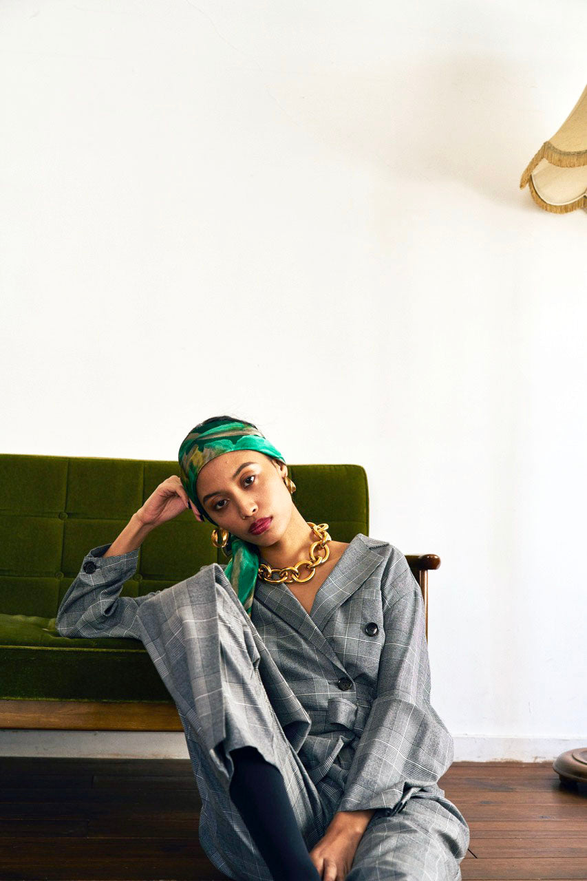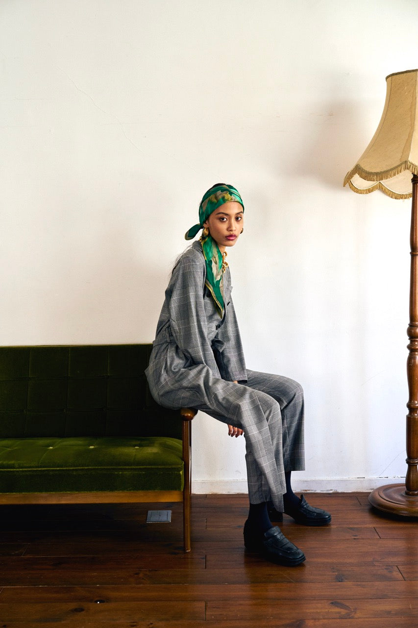 Tailored suit-like all-in-one jumpsuit made of a fine light weight wool blend plaid. The slightly curved, three-dimensional sleeve shape and the semi-wrap skirt design.