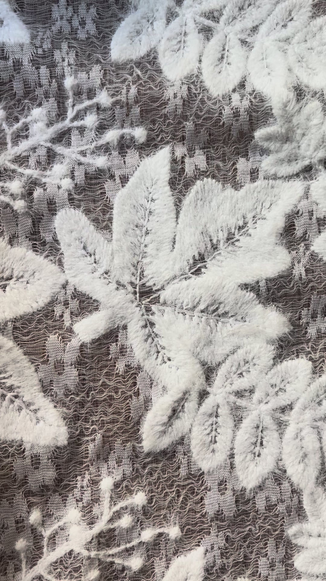 Crafted from embroidered lace, this fabric features delicate raised textures with a soft, fuzzy touch. The intricate embroidery and subtle dimensional details create a refined yet modern elegance, making it a statement piece for both everyday wear and special occasions. The S/M size relaxed fit that comfortably accommodates sizes 2 through 6 (see measurements).